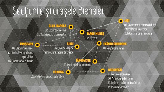 Editia din acest an include mai multe sectiuni (15) comparativ cu anii anteriori, pentru a cuprinde noile generatii in competitia nationala, studenti si absolventi, tineri arhitecti, dar si pentru a cuprinde complexitatea manifestarilor si a expresiilor contemporane ale arhitecturii si pentru a explora domenii noi, necesar a fi cunoscute si popularizate, precum arhitectura sustenabila, revitalizarea satelor, prezenta naturii in oras si grija pentru spatiul public comunitar, dar si formule de educatie si formare neconventionale, precum taberele de creatie, spun organizatorii.