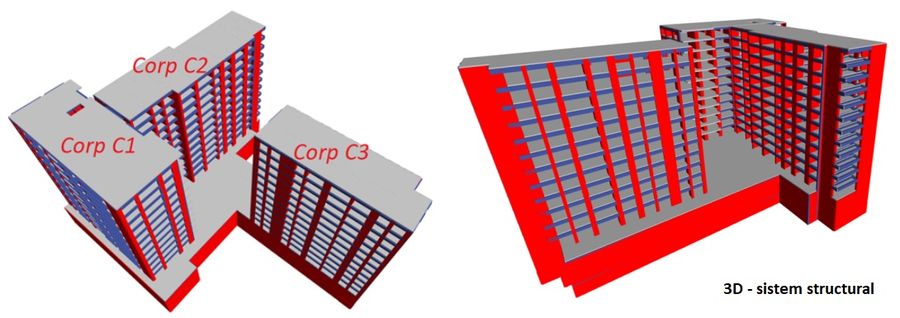 Structurile de rezistenta ale tuturor corpurilor au fost calculate in conformitate cu standardele, codurile si normativele in vigoare. S-au realizat modele 3D complete ale structurilor, ce includ si deformatiile elementelor structurale ale infrastructurii.