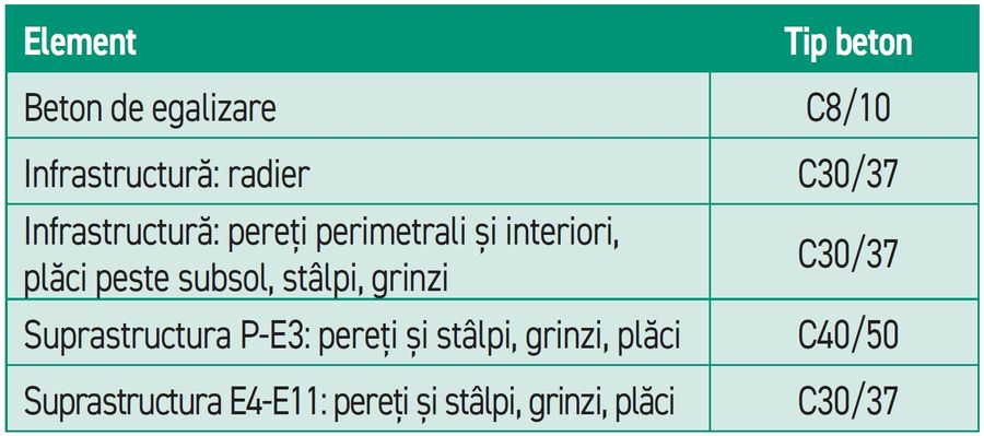 Toate materialele utilizate au certificate de calitate in conformitate cu normele in vigoare si sunt agrementate. Betoanele folosite si in cadrul structurii de rezistenta respecta specificatiile SR EN 1992-1-1, respectiv NE 012-1/2007 si NE 012-1/2010 si variaza astfel: