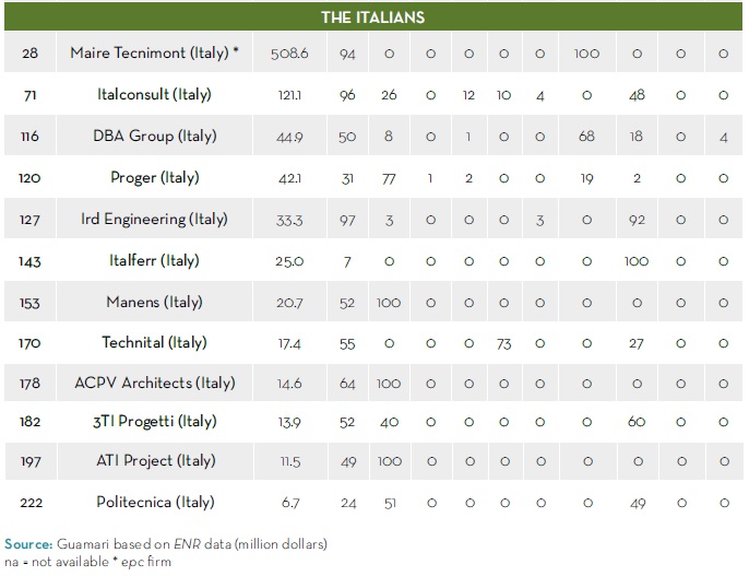 Ca pondere, cele 12 companii italiene de constructii (fara Saipem, care ar schimba datele) au o cota de 3,8% in piata celor 250 de contractori globali inclusi in topul ENR. In clasamentul anterior, care a inclus si Saipem, cota italienilor a fost de 5,6%. Saipem are o cifra de afaceri anuala de peste 10 miliarde euro.