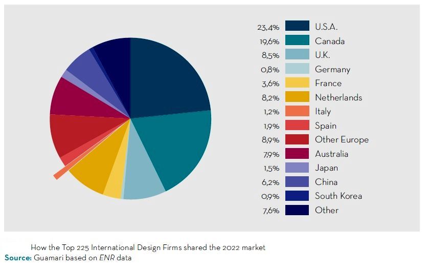 Piata italiana de constructii continua sa fie atractiva pentru grupurile internationale de design, numarul subsidiarelor acestora aflandu-se in crestere in ultimii ani, pe fondul unui sector italian dominat de companii mici si foarte fragmentat. Potrivit unei cercetari ad-hoc a Guamari, numarul filialelor internationale ale marilor companii globale prezente pe piata italiana de design a crescut de la 25 conform clasamentului pe baza cifrelor din 2021 la 27 in 2022 (analiza a fost intocmita pe baza listei ENR cu cele mai mari companii de arhitectura si inginerie). Conform cifrelor de afaceri din 2022, cea mai mare companie internationala activa in Italia este WSP (Canada), urmata de Pini Group. Cinci companii au sediul in SUA si cate 3 provin din Marea Britanie, Germania si Olanda. Celelalte tari au cate una sau doua grupuri exportatoare de servicii de arhitectura si inginerie in Italia.