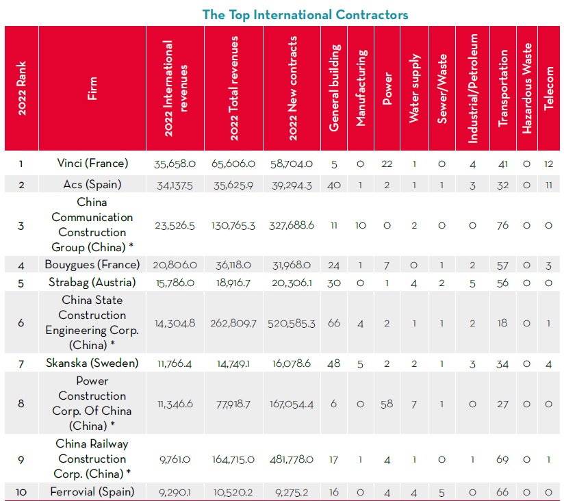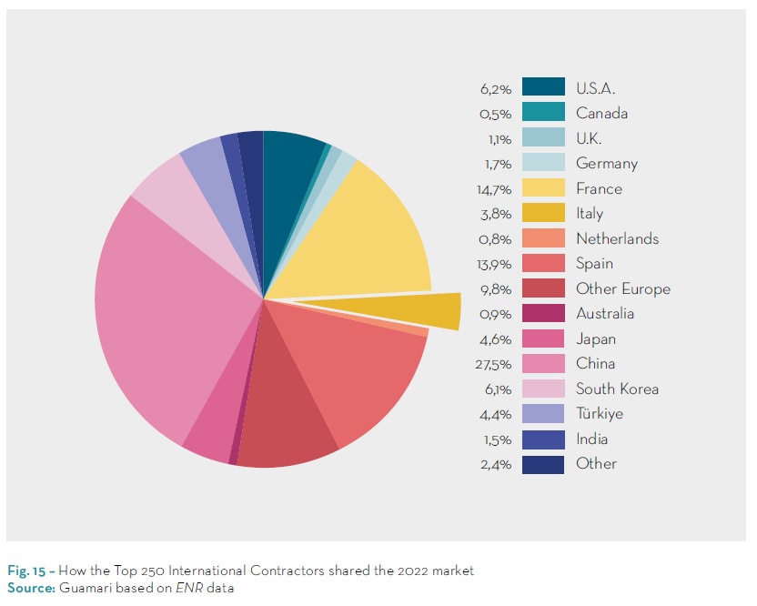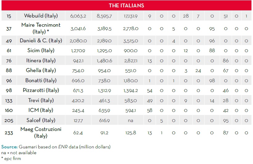 Performantele globale ale antreprenorilor de constructii sunt mult mai bune comparativ cu cele ale firmelor de arhitectura si inginerie. Si in acest caz, Saipem, cea mai bine clasata companie italiana in topul global al constructorilor, nu a transmis date, denaturand rezultatele generale si clasand Italia pe o pozitie inferioara celei pe care o are, de fapt, conform analizei Guamari realizate pe baza topurilor ENR. In total, clasamentul ENR 250 include 12 companii italiene care exporta lucrari de constructii (ar fi trebuit sa fie 13 cu Saipem), cel mai bine pozitionat fiind grupul Webuild (fostul Salini Impregilo), urmat de societatile Sicim, Itinera (parte a grupului Gavio), Ghella, Pizzarotti si ICM (fosta Maltauro). Celelalte companii sunt firme specializate in diferite categorii de lucrari, respectiv Bonatti (instalatii edilitare), Trevi (fundatii), Salcef (cai ferate) si Maeg Costruzioni (constructii metalice).