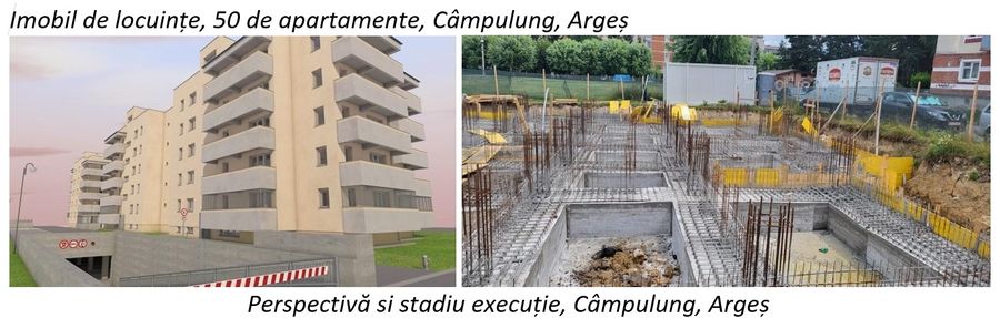 In segmentul de proiecte cu destinatia de cladiri de locuit avem in implementare, fiind deja avizat si autorizat, un proiect compus din trei corpuri de cladiri, in municipiul Campulung, avand o suprafata desfasurata de 4.741mp si un numar total de 50 de apartamente. Fiecare corp are regimul de inaltime D+P+4E, fiind prevazut inclusiv cu o parcare subterana adiacenta functiunii de locuit.