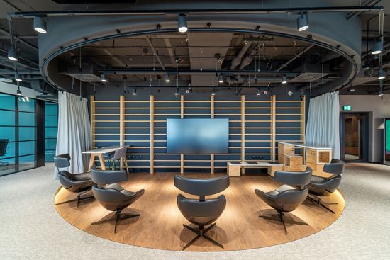 Zona principala de intalniri, asa numita Pitch Arena, este tratata diferentiat, fiind asemuita unui teren de sport cu o pardoseala traditionala din lemn. Aceasta coboara o treapta raportat la restul spatiului si este delimitata printr-o cortina fonoabsorbanta. Intreg semicercul este luminat de o multitudine de corpuri punctuale ce recreaza senzatia expunerii sub lumina reflectoarelor, insufland dinamism tuturor interactiunilor din acest spatiu. Plafonul tehnic al spatiului principal, precum si elementele de beton aparent au fost curatate si mentinute expuse, in contrast cu caracterul soft al pardoselii, al elementelor fonoabsorbante si al vegetatiei. Toate aceste elemente sunt unificate printr-un concept de iluminat si de plafon croit pentru acest proiect care le evidentiaza calitatile, creand un spatiu nuantat si dinamic, cu caracteristici ce sunt departe de cele ale spatiilor de birouri conventionale.