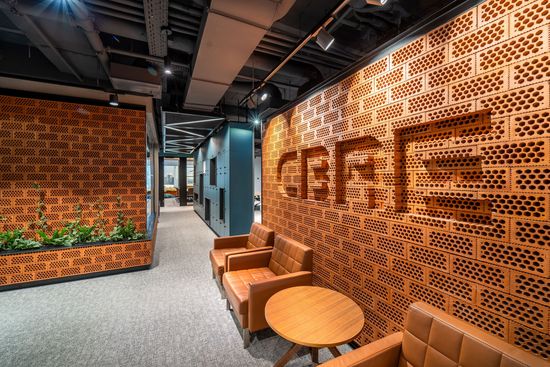 Spatiul a fost structurat in zone de lucru standard, dar si o gama larga de arii informale, locuri de munca flexibile si zone de discutii care incurajeaza atat concentrarea individuala, cat si interactiunea in echipa. Caramida devine laitmotivul amenajarii, fiind folosita in diverse moduri ce creeaza modele surprinzatoare in fiecare spatiu. Inca de la intrare, peretele frontal placat cu caramida cu goluri hexagonale, un element puternic de primire a vizitatorilor, capteaza atentia. In spatele acestui zid, care adaposteste si doua cabine izolate fonic destinate concentrarii individuale sau conversatiilor telefonice private, se dezvaluie un spatiu cu o estetica eminamente tehnica, o interpretare a locului informal al discutiilor din santierele de lucru.