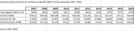Piata serviciilor de arhitectura a inregistrat o valoare estimata la 746,85 milioane de lei (166,3 milioane de euro) in 2016, potrivit unui studiu comandat de Ordinul Arhitectilor din Romania (OAR) si realizat de IMAS. Potrivit datelor disponibile, afacerile totale din sector au crescut cu 10,6% fata de nivelul de 675,2 milioane de lei din 2015. Valoric, piata de arhitectura se situa, la finele anului 2016, la un nivel similar celui din anul 2007 (758,12 milioane de lei). Studiul IMAS a fost realizat pe un esantion de aproape 2.500 de societati comerciale incadrate in codul CAEN 7111 - Activitati de arhitectura, valoarea pietei fiind calculata dupa indicatorul cifrei de afaceri, care reprezinta totalitatea vanzarilor facturate de agentul economic respectiv, pe parcursul unui an calendaristic, fara TVA si fara a include veniturile financiare (dividende, dobanzi etc.) si exceptionale (vanzari de active etc.).Intitulat "Piata de servicii profesionale a agentilor economici cu profil de arhitectura 2007-2016", noul studiu realizat de IMAS reflecta ca, in prezent, piata serviciilor de arhitectura, puternic afectata de criza financiara manifestata in anii 2009-2010, reintra intr-o etapa de crestere. Dinamica ascendenta a cifrei de afaceri indica, pentru anul 2016, o crestere de aproximativ 40% fata de perioada de varf a recesiunii (2009-2010). "Schimbarile de profunzime petrecute in exercitarea profesiilor liberale pe parcursul ultimului deceniu sunt in mica masura rezultatul impus prin intrarea pe piata a unor noi generatii, cat efectul modernizarii tehnologice si institutionale. Criza pietelor financiare si liberalizarea pietei serviciilor pe tot teritoriul Uniunii Europene au amprentat puternic toate domeniile de activitate, determinand structurarea unei palete mai mult sau mai putin diferentiate a strategiilor de insertie si rezistenta pe piata a agentilor economici. Studiul arata ca exista un numar redus de firme care s-au instalat pe piata inainte de 2012 si care o domina, detinand constant peste 30% din aceasta. Presupunem ca cele mai multe dintre acestea recurg la strategii manageriale, la urmarirea parametrilor economici cu care lucreaza, si aceste practici le ofera avantaje competitionale pe piata", se arata in introducerea studiului IMAS.
