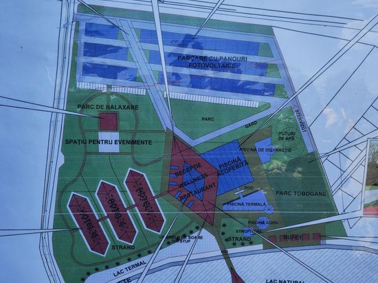 "Am cumparat o ferma de porci dezafectata, era o zona absolut negestionata, neadministrata. Sper sa reusim sa facem printesa din broasca. Balta noastra era asezata pe malul fermei. In locul punctul de informare turistica a fost groapa de gunoi a comunei. Astazi s-a nascut frumos o poveste faina, o magie. Ce incercam este un proiect care poate fi gestionat. Parcarea de la intrare va fi acoperita toata cu panouri fotovoltaice si va produce energie pentru aceasta investitie. Apoi avem zona de receptie, care contine piscina, piscina acoperita, wellness si restaurant cu toate serviciile. E in forma de romb, dar poate suferi modificari, inca nu este batuta in cuie. Propunem trei hoteluri de 4 stele, care nu intra in proiect. Ele vor fi oferite spre concesionare daca noi reusim sa facem investitia. Avem zona de tobogane exterioare, zona de relaxare si spatii speciale pentru copii, cu fantani arteziene si jocuri", a spus Dumitru Pop.