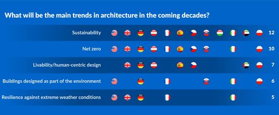 10 tari din cercetare mentioneaza Net Zero ca fiind o tendinta cheie in arhitectura reflecta presiunile legale existente pentru a realiza imbunatatiri in acest domeniu.