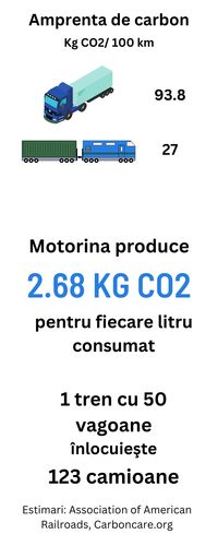 - In mod generic, in urma arderii unul litru de motorina rezulta 2,68 Kg CO2 plus alte particule poluatoare. Aceasta este amprenta de carbon denumita TTW (tank to wheel), rezultata strict din arderea combustibilului. Amprenta totala se calculeaza adaugand si emisiile rezultate pentru extragerea si prelucrarea titeiului, rezultand amprenta WTW (well to wheel). Amprenta de carbon a transportului intermodal se calculeaza insumand emisiile rezultate pe fiecare tip de transport utilizat. Am estimat, folosind mai multe metode din literatura de specialitate, amprenta de carbon specifica transportului unui container de 20 de tone pe mai multe rute, in regim rutier si feroviar. De exemplu, pentru transportul unui astfel de container pe ruta Aiud-Constanta, emisiile de CO2 produse de un camion sunt de aproximativ 715 kg CO2, in timp ce emisiile asociate transportului feroviar al aceluiasi container sunt de numai 165 kg CO2 (de 4 ori mai putin). Valorile asociate transportului feroviar sunt dependente in principal de intensitatea emisiilor de carbon asociate producerii energiei electrice (presupunand ca se foloseste numai linie elictrificata). Cu cat energia produsa este mai verde, cu atat economia facuta prin alegerea transportului feroviar este mai mare. In Romania, amprenta de carbon asociata producerii unui kWh de energie electrica este de circa 370 g CO2, in timp ce media UE este de 296 g CO2 (date la nivelul anului 2019). Cresterea eficientei motoarelor diesel este dificil sa mai inregistreze progrese notabile, dar prin sustinerea surselor verzi de energie, intensitatea emisiilor de carbon asociate acesteia se afla in continua scadere, practic injumatatindu-se in ultimii 30 de ani.
