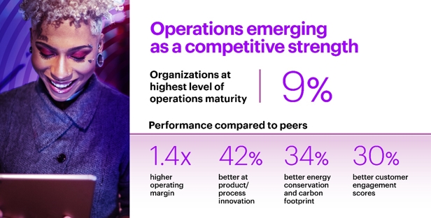 In cadrul studiului, organizatiile au fost evaluate pe baza a sase indicatori de maturitate operationala: inteligenta artificiala, date, procese, talente, colaborare si experienta partilor interesate. Desi doar cateva companii (9%) au atins maturitatea pe toate planurile, cele care au reusit au inregistrat in medie marje operationale de 1,4 ori mai mari decat cele ale concurentilor, si, in acelasi timp, a generat inovare cu 42% mai rapida, un grad de sustenabilitate mai ridicat cu 34% si scoruri de satisfactie cu 30% mai mari.