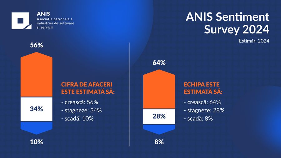 Potrivit ANIS Sentiment Survey, 64% dintre companiile IT vor sa termine 2024 cu o echipa mai mare decat in 2023. 28% dintre respondenti estimeaza ca echipa lor va stagna in acest an si numai 8% considera ca aceasta va scadea pe parcursul anului.
