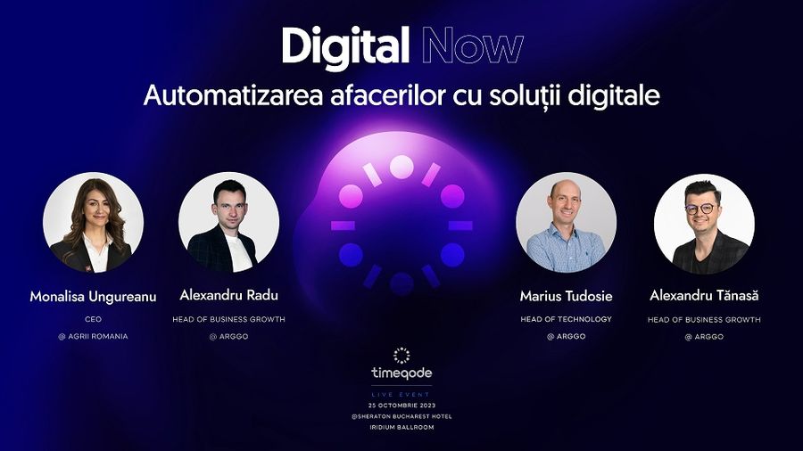 Speakerii invitati sunt: Monalisa Ungureanu - CEO @Agrii Romania, Marius Tudosie – Head of Technology @Arggo, Alexandru Radu - Head of Business Growth @Arggo si Alexandru Tanasa – Digital Business Advisor @Arggo. Ei vor aborda tema digitalizarii in afaceri, de la solutii standard consacrate pana la solutii complet personalizate si vor oferi perspective tangibile asupra acestui subiect. Pentru inregistrarea la eveniment puteti accesa acest link.