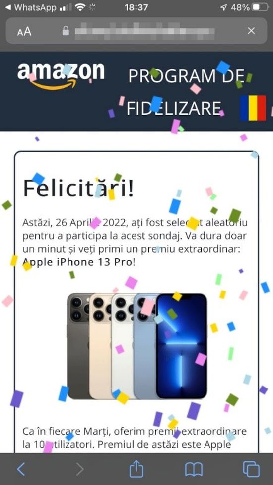 Flubot nu ruleaza pe sistemul de operare iOS. Insa, atunci cand proprietarii de iPhone acceseaza linkurile infectate, ei sunt redirectionati catre site-uri de phishing si escrocherii. In exemplul de mai jos, se desfasoara o escrocherie mascata intr-un sondaj prin care victimele sunt incurajate sa raspunda la cateva intrebari de cercetare de piata pentru a primi garantat un iPhone 13.