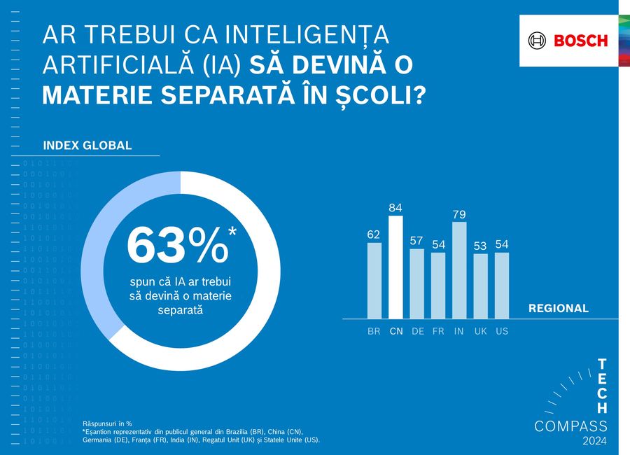 Inteligenta artificiala (IA) va fi tehnologia dominanta a urmatorului deceniu. Drept urmare, abilitatile in domeniul IA vor deveni din ce in ce mai importante atat in viata noastra profesionala, cat si in cea personala. Acesta este punctul de vedere larg impartasit de cele peste 11.000 de persoane din intreaga lume chestionate in cadrul sondajului Bosch Tech Compass de anul acesta. In Germania, un procent de 72% considera ca IA va fi tehnologia dominanta a urmatorului deceniu in tara lor. Cu doar doi ani in urma, proportia era de numai 42 la suta. Cu alte cuvinte, respondentii din Germania vad acum un potential si mai mare al tehnologiei decat cei din restul lumii, al caror procentaj este de 67%. Aceiasi respondenti considera inteligenta artificiala mult mai importanta decat orice alta tehnologie. In Germania, robotii industriali sunt pe locul doi, mentionati de 25 la suta dintre respondenti, 23 la suta alegand hidrogenul si celulele de carburant. La nivel mondial, tehnologia 5G este pe locul doi, mentionata de 32% dintre respondenti, in timp ce 24% au mentionat conducerea automata.