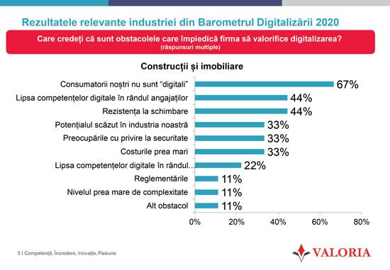 "Vom vedea care este si motivul in cele ce urmeaza, odata cu raspunsurile la intrebarea «Care credeti ca sunt obstacolele care impiedica firma sa valorifice digitalizarea?». Este o tendinta generala, nu numai in constructii si imobiliare, cu exceptia retailului, sa se raspunda cu «consumatorii nostri nu sunt digitali». Dar este important de subliniat ca ei sunt constienti de lipsa competentelor digitale in randul angajatilor, de o anumita rezistenta la schimbare. Ei mai indica aici si potentialul scazut pentru digitalizare a industriei de constructii, ceea ce se conecteaza si cu raspunsul la prima intrebare - referitoare la influenta redusa a digitalizarii. Acestea sunt principalele obstacole percepute de catre respondentii din constructii si imobiliare", a mai spus analistul de la Valoria in cadrul EURO-Constructii.
