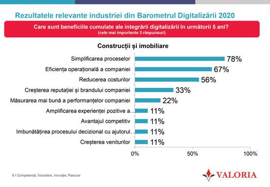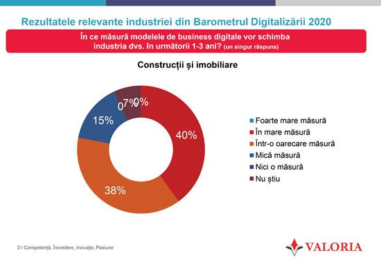 La intrebarea «In ce masura compania a fost influentata pana acum de digitalizare?», 38% dintre respondentii din constructii si imobiliare spun ca intr-o foarte mare masura, iar 8% intr-o oarecare masura. Foarte interesant, 46% spun ca intr-o mica masura si 8% nu stiu. "Asadar, in aceasta zona parerile sunt impartite, dar situatia nu arata, in ansamblu, tocmai optimist. «In ce masura modelele de business digitale vor schimba aceasta industrie in urmatorii 1-3 ani?» Au raspuns cu intr-o mare masura 40% din respondenti, intr-o oarecare masura 38%, intr-o mica masura 15%, nu stiu au spus 7%. Asadar, companiile din constructii si imobiliare sunt constiente, pe de o parte, ca modelele digitale de business vor influenta aceasta industrie, dar, pe de alta parte, nu prea au facut ceva in acest sens", a explicat reprezentantul Valoria.
