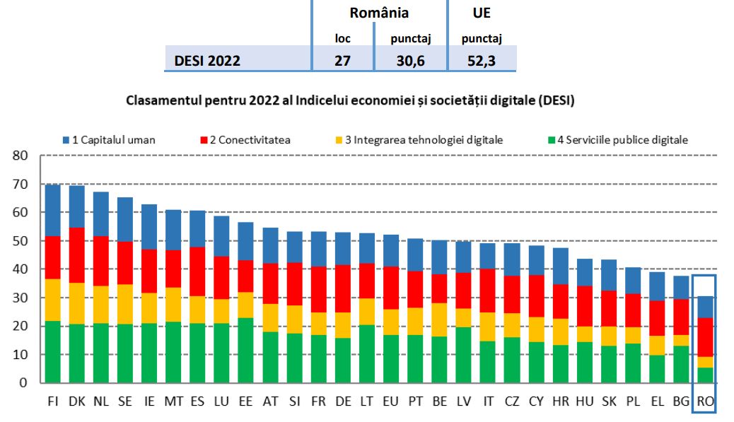 Romania se situeaza pe locul 27 din cele 27 de state membre ale UE in editia din 2022 a Indicelui economiei si societatii digitale (DESI), iar cresterea anuala relativa a tarii noastre este inferioara celei a statelor similare, ceea ce indica faptul ca nu este convergenta cu restul tarilor membre. Romania a ramas in urma in ceea ce priveste o serie de indicatori ai dimensiunii capitalului uman, cu un nivel foarte scazut de competente digitale de baza in comparatie cu media UE, dar isi mentine locurile fruntase in ceea ce priveste proportia femeilor specialiste in domeniul TIC din forta de munca (locul 2) si numarul absolventilor in domeniul TIC (locul 4)."O schimbare semnificativa a ritmului de pregatire a Romaniei in ceea ce priveste competentele digitale este esentiala pentru ca UE sa atinga obiectivul deceniului digital privind competentele digitale de baza si specialistii in domeniul TIC. Romania are rezultate relativ bune in ceea ce priveste conectivitatea, aceasta reprezentand dimensiunea pentru care obtine cel mai bun punctaj. Proportia utilizarii serviciilor de acoperire de banda larga fixa de cel putin 100 Mbps (57%) si prin retelele fixe de foarte mare capacitate (87%) depaseste media UE. Acest lucru este, de asemenea, important avand in vedere obiectivul deceniului digital de acoperire in proportie de 100% a tuturor gospodariilor prin retelele de gigabiti pana in 2030. Cu toate acestea, performantele tarii in ceea ce priveste integrarea tehnologiilor digitale si a serviciilor publice digitale sunt slabe in comparatie cu cele ale celorlalte state membre ale UE", se arata in raportul DESI 2022, referitor la Romania.