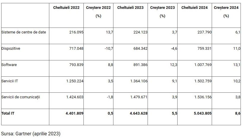 Cheltuielile IT la nivel mondial sunt estimate sa insumeze 4,6 trilioane USD in 2023, in crestere cu 5,5% fata de 2022, conform ultimei prognoze date publicitatii de Gartner. In pofida turbulentelor ce afecteaza in mod continuu economia globala, se estimeaza ca in 2023 toate regiunile de pe glob vor marca o evolutie pozitiva a cheltuielilor IT."Problemele macroeconomice nu incetinesc transformarea digitala. Cheltuielile IT vor ramane consistente, chiar daca se preconizeaza ca multe tari vor avea o evolutie minima a produsului intern brut (PIB) si o inflatie ridicata in 2023. Prioritizarea va fi esentiala, deoarece directorii IT cauta sa optimizeze cheltuielile folosind tehnologia digitala pentru a transforma propunerea de valoare a companiei, veniturile acesteia si interactiunile cu clientii", a declarat John-David Lovelock, Distinguished VP Analyst la Gartner.