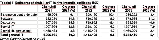 Tehnologiile care sunt mentinute in companii fata de cele care sustin procesele de afaceri sunt evidentiate prin ratele lor de crestere proiectate in 2023. Exista suficiente cheltuieli pe piata centrelor de date pentru a mentine centrele de date locale existente, dar noile cheltuieli continua sa fie orientate catre optiunile cloud, asa cum demonstreaza cresterea estimata pentru 2023 de 11,3% a cheltuielilor pentru software.