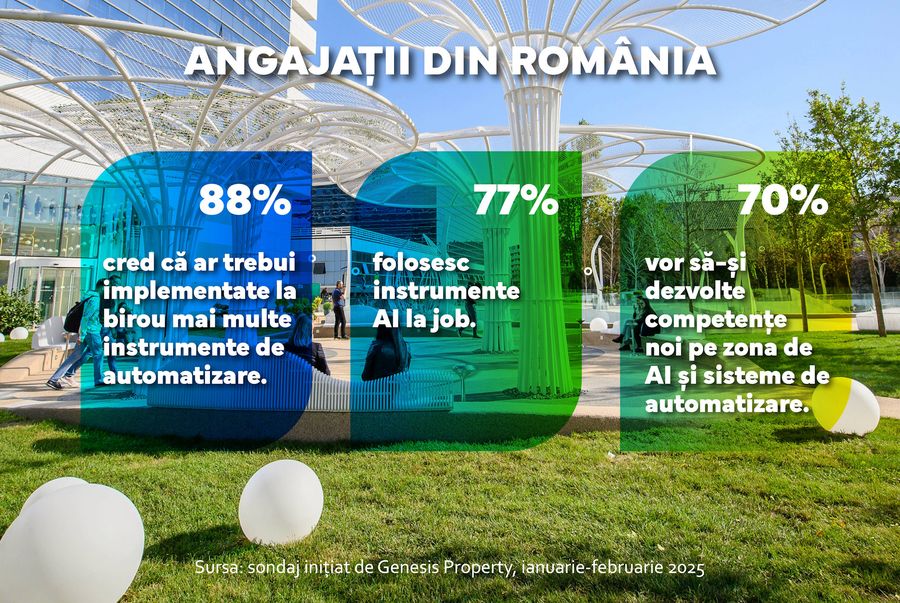 Inteligenta Artificiala este tot mai prezenta in viata de zi cu zi, atat la serviciu, cat si acasa, iar beneficiile sale, inclusiv cele legate de reducerea timpului alocat sarcinilor repetitive si redundante, sunt tot mai apreciate. 77% dintre angajati folosesc instrumente bazate pe AI zilnic sau ocazional la locul de munca, potrivit unui sondaj realizat in randul a 1.175 de respondenti la nivel national de Genesis Property, unul dintre cei mai importanti proprietari de cladiri de birouri din Romania. Mai mult, 88% dintre respondenti considera ca biroul lor ar trebui sa aiba mai multe instrumente de automatizare, care sa le faca munca mai usoara, iar 70% vor sa-si dezvolte noi competente pe zona de AI si sisteme de automatizare.Pentru cei mai multi angajati (41,4%), AI ar trebui sa fie ca un mentor virtual care sa stie raspunsuri la toate intrebarile, iar 37,2% il vad ca pe un geniu tacut, capabil sa faca task-uri mai complicate fara sa aiba altfel de input-uri. Totodata, aproape 50% considera ca AI va fi folosit tot mai mult in 2025 pentru a simplifica multe activitati, dar nu va inlocui rolul oamenilor.