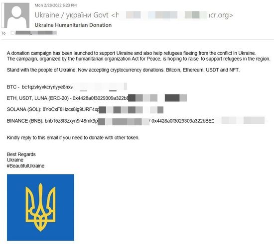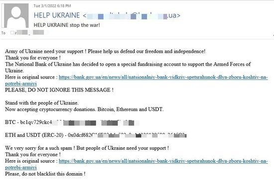 O anumita campanie, care folosea ca subiect „Fiti alaturi de poporul ucrainean. Acceptam acum donatii in criptomonede. Bitcoin, Ethereum si USDT", provenind de la adrese IP din China, a ajuns la zeci de mii de casute de e-mail pe 2 martie. 25% dintre e-mailurile inselatoare au fost directionate catre utilizatori din Marea Britanie, 14% din SUA, iar unul din 25 de mesaje a vizat tinte din Romania.