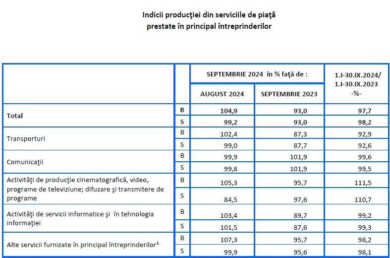 In primele 9 luni ale acestui an, comparativ cu perioada corespunzatoare din 2023, cifra de afaceri din serviciile de piata prestate in principal intreprinderilor, serie bruta, a scazut, pe ansamblu, cu 2,3%, ca urmare a scaderii inregistrate la activitatile de transporturi (-7,1%), alte servicii furnizate in principal intreprinderilor1 (-1,8%), activitatile de servicii informatice si in tehnologia informatiei (-0,8%) si la cele de comunicatii (-0,4%). Activitatile de productie cinematografica, video, programe de televiziune; difuzare si transmitere de programe au crescut cu 11,5%. Ca serie ajustata, in intervalul ianuarie - septembrie 2024, raportat la perioada corespunzatoare din 2023, cifra de afaceri din serviciile de piata prestate in principal intreprinderilor a scazut, pe ansamblu, cu 1,8%.