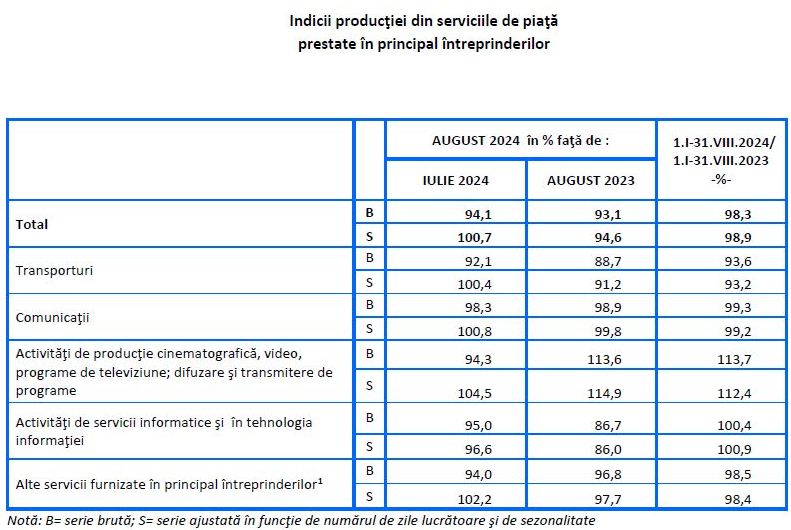 In primele 8 luni ale acestui an, comparativ cu perioada corespunzatoare din 2023, cifra de afaceri din serviciile de piata prestate in principal intreprinderilor, serie bruta, a scazut, pe ansamblu, cu 1,7%, ca urmare a scaderii inregistrate la activitatile de transporturi (-5,7,%), alte servicii furnizate in principal intreprinderilor (-1,5%) si la activitatile de comunicatii (-0,7%). Cresteri au inregistrat: activitatile de productie cinematografica, video, programe de televiziune; difuzare si transmitere de programe (+13,7%) si activitatile de servicii informatice si in tehnologia informatiei (+0,4%). Ca serie ajustata, in intervalul ianuarie - august 2024, raportat la perioada corespunzatoare din 2023, cifra de afaceri din serviciile de piata prestate in principal intreprinderilor a scazut, pe ansamblu, cu 1,1%.