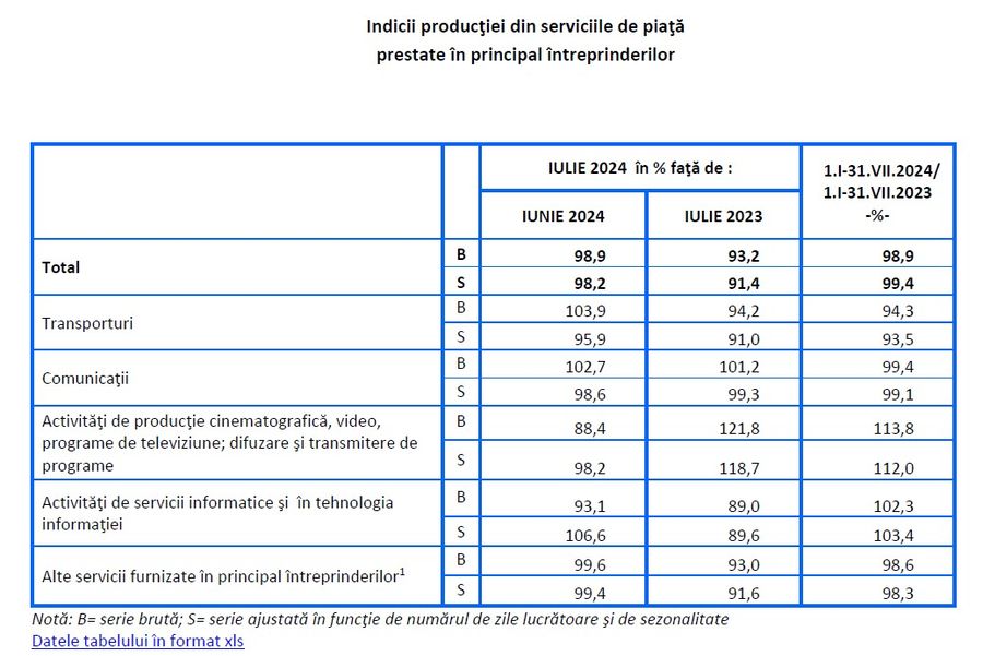 In primele 7 luni ale acestui an, comparativ cu perioada corespunzatoare din 2023, cifra de afaceri din serviciile de piata prestate in principal intreprinderilor, serie bruta, a scazut, pe ansamblu, cu 1,1%, ca urmare a scaderii inregistrate la activitatile de transporturi (-5,7%), alte servicii furnizate in principal intreprinderilor (-1,4%) si la activitatile de comunicatii (-0,6%). Cresteri au inregistrat: activitatile de productie cinematografica, video, programe de televiziune; difuzare si transmitere de programe (+13,8%) si activitatile de servicii informatice si in tehnologia informatiei (+2,3%). Ca serie ajustata, in intervalul ianuarie - iulie 2024, raportat la perioada corespunzatoare din 2023, cifra de afaceri din serviciile de piata prestate in principal intreprinderilor a scazut, pe ansamblu, cu 0,6%.