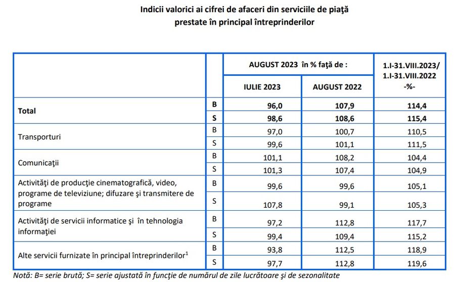 Cifra de afaceri din serviciile de piata prestate in principal intreprinderilor a crescut in primele opt luni ale acestui an cu 14,4%, in termeni nominali, ca serie bruta, iar ca serie ajustata in functie de numarul de zile lucratoare si de sezonalitate s-a majorat cu 15,4% fata de aceeasi perioada din 2022, arata datele Institutului National de Statistica (INS). Evolutia bruta s-a datorat cresterilor inregistrate la cifra de afaceri din: alte servicii furnizate in principal intreprinderilor (+18,9%), activitatile de servicii informatice si in tehnologia informatiei (+17,7%), activitatile de transporturi (+10,5%), activitatile de productie cinematografica, video, programe de televiziune; difuzare si transmitere de programe (+5,1%) si activitatile de comunicatii (+4,4%). August 2023 comparativ cu iulie 2023