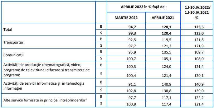 Cifra de afaceri din serviciile de piata prestate in principal intreprinderilor, serie bruta, in luna aprilie 2022, comparativ cu luna aprilie 2021, a crescut, in termeni nominali, pe ansamblu, cu 20,1%, datorita cresterii cifrei de afaceri din activitatile de servicii informatice si in tehnologia informatiei (+40,9%), activitatile de productie cinematografica, video, programe de televiziune; difuzare si transmitere de programe (+24,0%), activitatile de transporturi (+19,5%), alte servicii furnizate in principal intreprinderilor (+17,1%) si din activitatile de comunicatii (+5,5%).