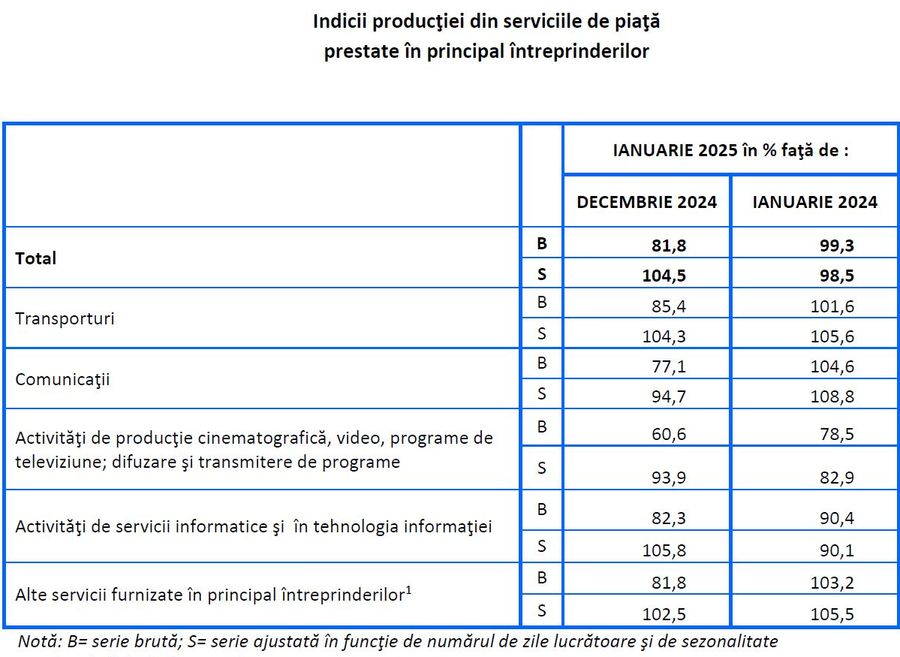 Fata de luna ianuarie 2024, cifra de afaceri din serviciile de piata prestate in principal intreprinderilor, in luna ianuarie 2025, a scazut, atat ca serie bruta cu 0,7%, cat si ca serie ajustata in functie de numarul de zile lucratoare si de sezonalitate cu 1,5%. Scaderea bruta de 0,7% reprezinta rezultatul contractiei cifrei de afaceri din activitatile de productie cinematografica, video, programe de televiziune; difuzare si transmitere de programe (-21,5%) si din activitatile de servicii informatice si in tehnologia informatiei (-9,6%). Cresteri au inregistrat activitatile de comunicatii (+4,6%), alte servicii furnizate in principal intreprinderilor (+3,2%) si activitatile de transporturi (+1,6%).