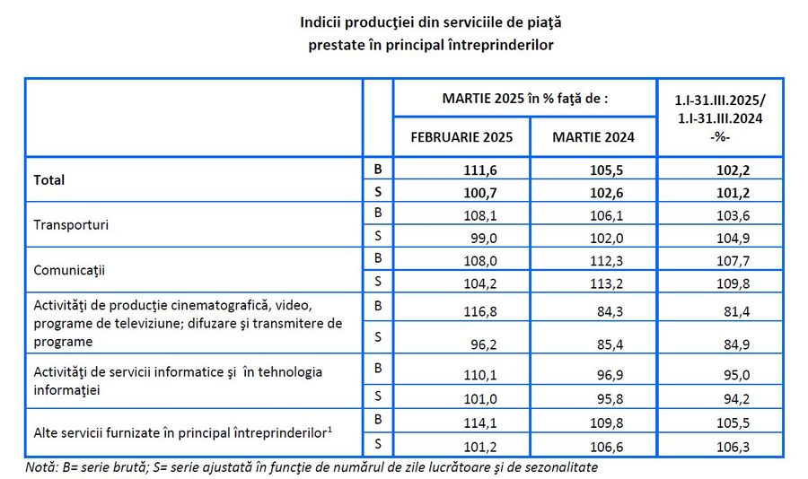 In luna martie 2025, cifra de afaceri din serviciile de piata prestate in principal intreprinderilor, a crescut, fata de luna februarie 2025, atat ca serie bruta cu 11,6%, cat si ca serie ajustata in functie de numarul de zile lucratoare si de sezonalitate, cu 0,7%. Evolutia bruta de 11,6% a fost inregistrata datorita cresterii cifrei de afaceri din activitatile de productie cinematografica, video, programe de televiziune; difuzare si transmitere de programe (+16,8%), alte servicii furnizate in principal intreprinderilor (+14,1%), activitatile de servicii informatice si in tehnologia informatiei (+10,1%), cele de transporturi (+8,1%), dar si din activitatile de comunicatii (+8%).