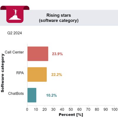 • Categorii de aplicatii software cu potential de crestere. Dinamica pietei de consum IT, dezvoltarea accelerata a anumitor industrii si rezultatele campaniilor de informare/educare influenteaza, de cele mai multe ori, cresterea interesului de achizitie pentru noi tipuri de aplicatii software. In trimestrul al doilea al acestui an, prin platforma Softlead a crescut in mod semnificativ interesul pentru solutii software din categoriile Call Center (23,9%), Robotic Process Automation - RPA (22,2%) si ChatBots (10,2%)