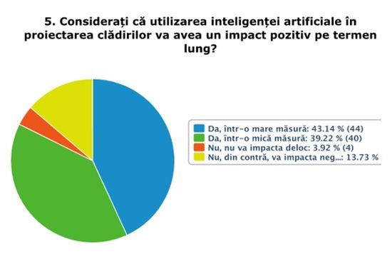 Majoritatea arhitectilor romani considera ca inteligenta artificiala le va influenta activitatea profe-sionala si 10% dintre acestia folosesc deja instrumente de AI in proiectele pe care le dezvolta, po-trivit IBC Focus. Si marii constructori autohtoni testeaza noile tehnologii bazate pe inteligenta artificiala, ba chiar un sfert dintre companiile de constructii analizeaza noile oportunitati generate de AI si cum ar putea fi integrata in activitatea operationala.Mai mult de jumatate dintre marii constructori (55%) afirma ca simt o intensificare a mediului concurential si, prin urmare, orice tehnologie noua care prezinta un potential de a creste avantajul competitiv in piata este deosebit de important, potrivit unui studiu IBC Focus. Pentru analiza re-alizata de IBC Focus au raspuns 102 dintre cele mai mari firme de arhitectura din Romania si 104 dintre cei mai mari constructori din tara.