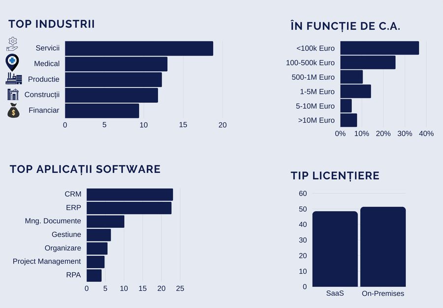 Aplicatiile software de tip enterprise, cum ar fi solutiile CRM (Customer Relationship Management), ERP (Enterprise Resource Planning) sau Managementul documentelor s-au aflat in topul prioritatilor in contextul digitalizarii in 2023. Elementul de noutate a fost adus de solutiile software de tip RPA (Robotic Process Automation) care inregistreaza o crestere de la an la an, apetitul pentru acest tip de aplicatii fiind impulsionat atat de eligibilitatea finantarii prin fonduri europene, cat si de cresterea notorietatii beneficiilor aduse.