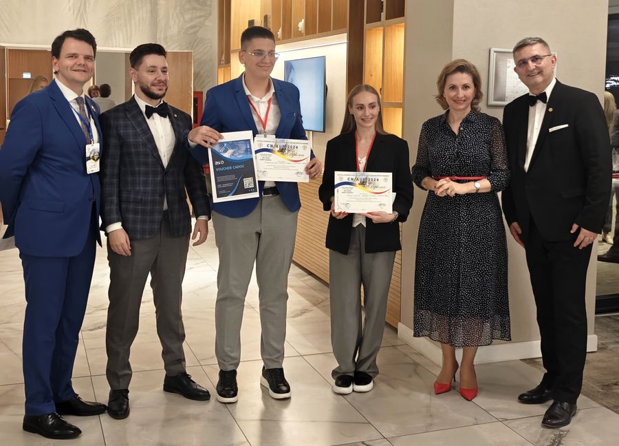 Andreea Anamaria Olteanu si Alexandru-Vasile Buhaescu de la TUIasi si Florin Alexandru Lunga si Alexandru Constantinescu de la UPT au primit mentiuni pentru lucrarile "Experimental Evaluation on the Energy Efficiency of a Water-Air Heat Recovery System", respectiv "Returning Lands Occupied by Photovoltaic Panels to Agricultural Use".