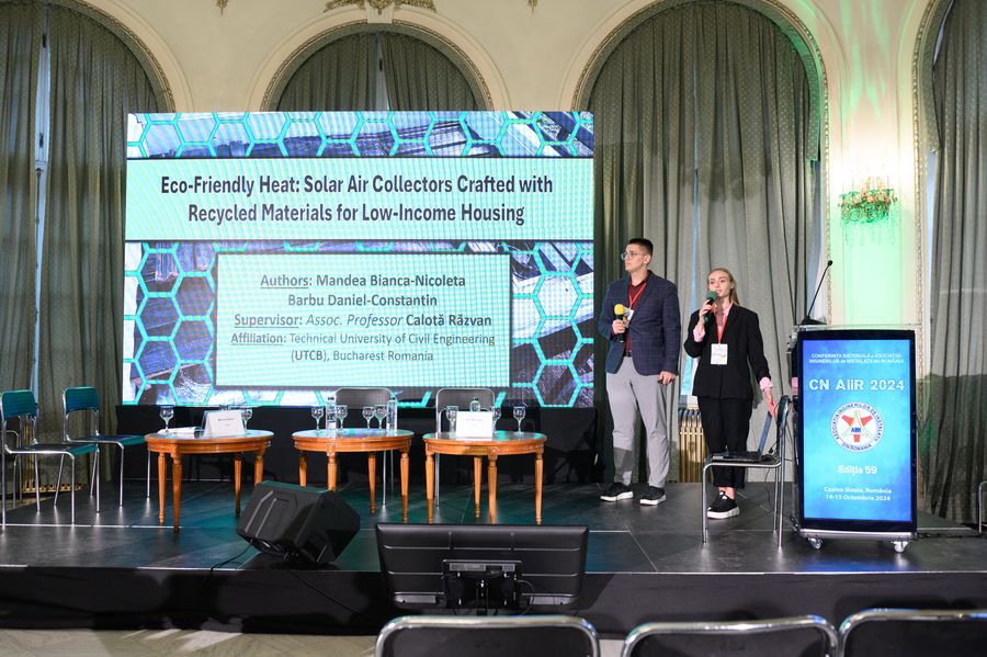 Castigatorii Concursului Studentesc AIIR & REHVA au fost Bianca Nicoleta Mandea si Daniel Constantin Barbu de la UTCB, care l-au avut ca mentor pe Conf.Univ.Dr.ing. Razvan Calota. Ei au prezentat lucrarea "Eco-Friendly Heat: Solar Air Collectors Crafted with Recycled Materials for Low-Income Housing".