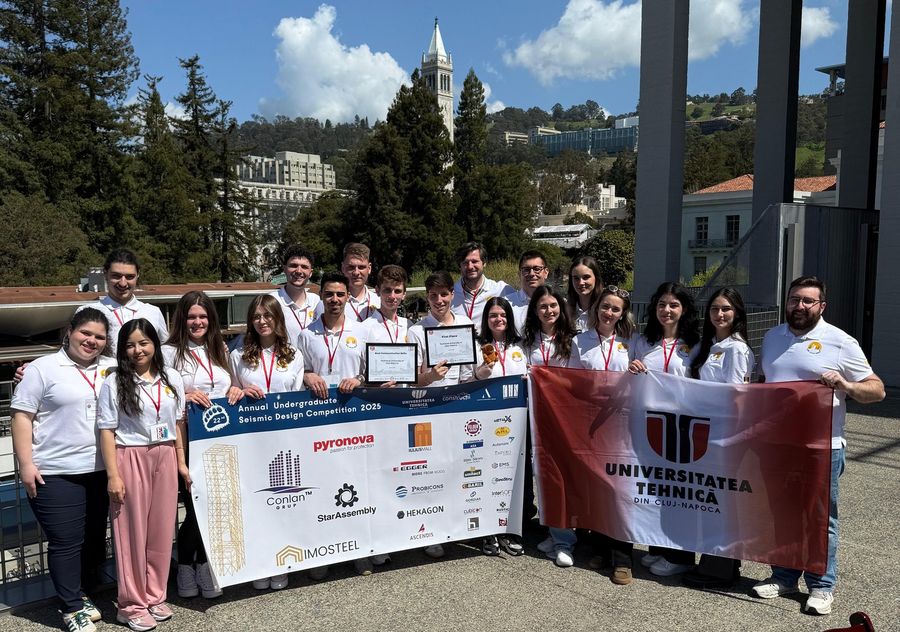 Studentii Facultatilor de Arhitectura si Inginerie Civila din cadrul Universitatii Tehnice din Cluj-Napoca (UTCN) au castigat locul 1 la Seismic Design Competition 2025, competitie internationala de design seismic desfasurat in Berkeley, California, in perioada 31 martie - 3 aprilie 2025. Echipa UTCN este formata din Cosmin Chiforescu (Team Captain), Horatiu Arion, Stefan Barabula, Diana Dersidan, Petra Marcu, Miruna Maxim, Stefania Oltianu, Eduard Pinzaru, Shamaiel Shamal, Andreea Soplea, Ioana Trisciuc, Maria Trusca. Consultantii echipei sunt Bologa Bianca, Bosi Paula, Mitrea Victor, Muresan Andrei, Teodorescu Robert, iar profesori Paul Moldovan si Ovidiu Prodan."Acest premiu reflecta munca intensa si pasiunea echipei noastre. Suntem onorati si mandri sa reprezentam Universitatea Tehnica din Cluj-Napoca la un nivel atat de inalt si sa aducem acasa acest titlu", a transmis Cosmin Chiforescu, capitanul echipei.