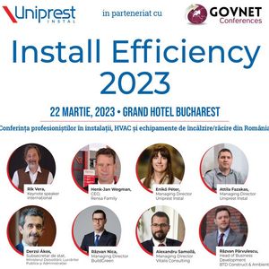 Prima editie a Install Efficiency, conferinta anuala a profesionistilor in instalatii, HVAC si echipamente de incalzire/ racire din Romania, va avea loc la data de 22 marie 2023, la Grand Hotel Bucharest, sala Fortuna, incepand cu ora 09:00. Evenimentul este organizat de compania Uniprest Instal, cu sprijinul GOVNET Romania, si va reuni specialisti din arii complementare, din domenii precum constructii si dezvoltare imobiliara rezidentiala, comerciala si industriala, cu viziuni locale si deopotriva internationale.Vorbitorii vor dezbate beneficiile sociale si economice ale proiectelor cu impact minim asupra mediului, explorand structuri, modele si cai de dezvoltare prin prisma eficientei. Cei 15 speakeri de top vor impartasi, astfel, cu cei peste 125 de invitati opinii, dezbateri si previziuni, intr-o analiza completa a eficientei energetice si a implicatiilor sale in industriile adiacente.