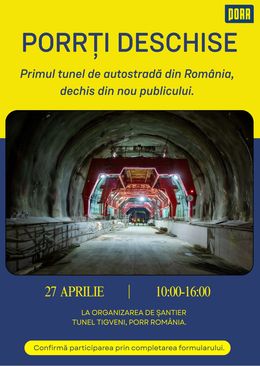 PORR Romania organizeaza o noua editie a Zilei portilor deschise la Tunelul Tigveni, in data de 27 aprilie 2025, in intervalul orar 10:00 - 16:00. Pe santierul sectiunii 4 (Tigveni - Curtea de Arges) a Autostrazii Sibiu - Pitesti (A1) lucrarile inainteaza rapid, stadiul apropiindu-se de 70%, la finalul lunii martie 2025. Sapatura primei galerii - Tunelul Daniela - a fost finalizata, iar la a doua galerie - Tunelul Alina - mai sunt de forat mai putin de 130 m.