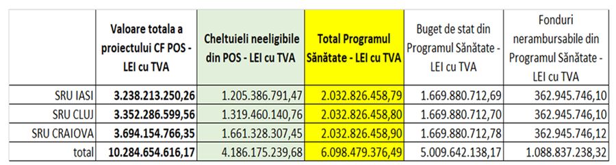 - Cele 3 proiecte se finanteaza din cheltuieli de la bugetul de stat, Programul Sanatate (POS 2021-2027), Autoritate de Management fiind Ministerul Investitiilor si Proiectelor Europene (MIPE). Anterior acestui program de finantare au fost asigurate fonduri prin Programul POR 2014-2020. Pentru asigurarea finantarii cheltuielilor de la bugetul de stat, au fost contractate de statul roman, prin Ministerul Finantelor, trei imprumuturi de la Banca Europeana de Investitii (BEI), pentru fiecare spital regional de urgenta mentionat anterior, astfel: 250 de milioane de euro pentru SRU Iasi, 305 milioane de euro pentru SRU Cluj si 368 milioane de euro pentru SRU Craiova. Cheltuielile eligibile din Programul Sanatate au doua surse de finantare, respectiv de la bugetul de stat si din fonduri europene nerambursabile (FEN)