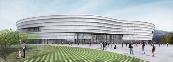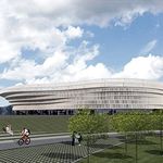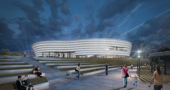 - Etajul 1 este alocat atat publicului, cat si VIP-urilor si presei, acestea din urma beneficiind de o zona cu acces separat, care este deservita de bar, restaurant si terasa adiacenta unei zone inierbate, necirculabile, de peste sala de incalzire. Atasat zonei de alimentatie sunt propuse o bucatarie, spatii de depozitare si spatii tehnice.