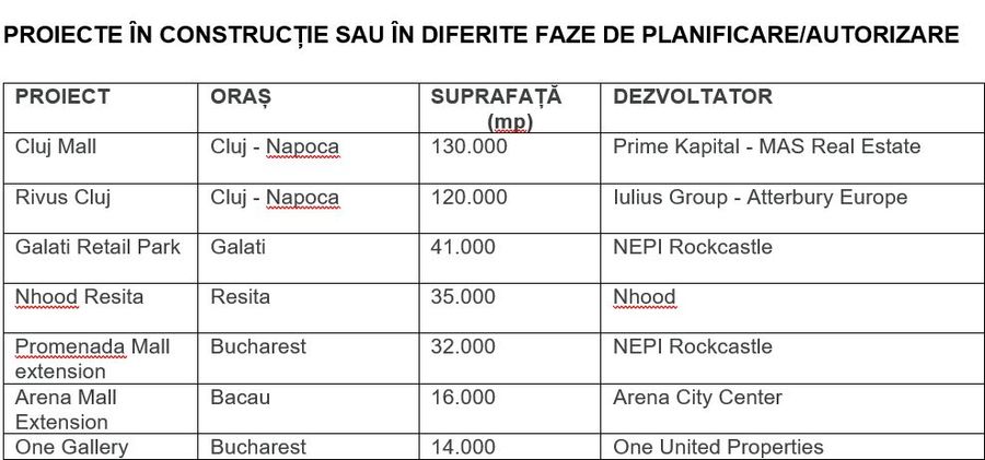 Stocul modern de retail din Romania este de 4,80 milioane de metri patrati (o densitate de 252 metri patrati la 1.000 de locuitori), in timp ce proiecte care depasesc 700.000 de metri patrati suprafata inchiriabila (GLA) se afla in diverse etape de constructie si planificare, urmand sa fie livrate pana la finalul acestui deceniu.