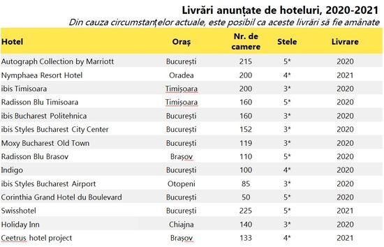 La nivel national se afla in constructie 14 hoteluri, cu peste 2.000 de camere noi si, inainte de decretarea starii de urgenta, acestea erau asteptate sa fie livrate in perioada 2020-2021, arata un raport al companiei imobiliare Crosspoint Real Estate. O alta tendinta remarcata este renovarea si modernizarea hotelurilor mai vechi, in special a celor cu arhitectura caracteristica si o istorie bogata.Desi aceste planuri ar putea fi amanate de investitori in contextul impactului major pe care il are criza generata de pandemia de coronavirus, analistii sunt de parere ca piata hoteliera din Romania are, in continuare, un potential ridicat de dezvoltare.