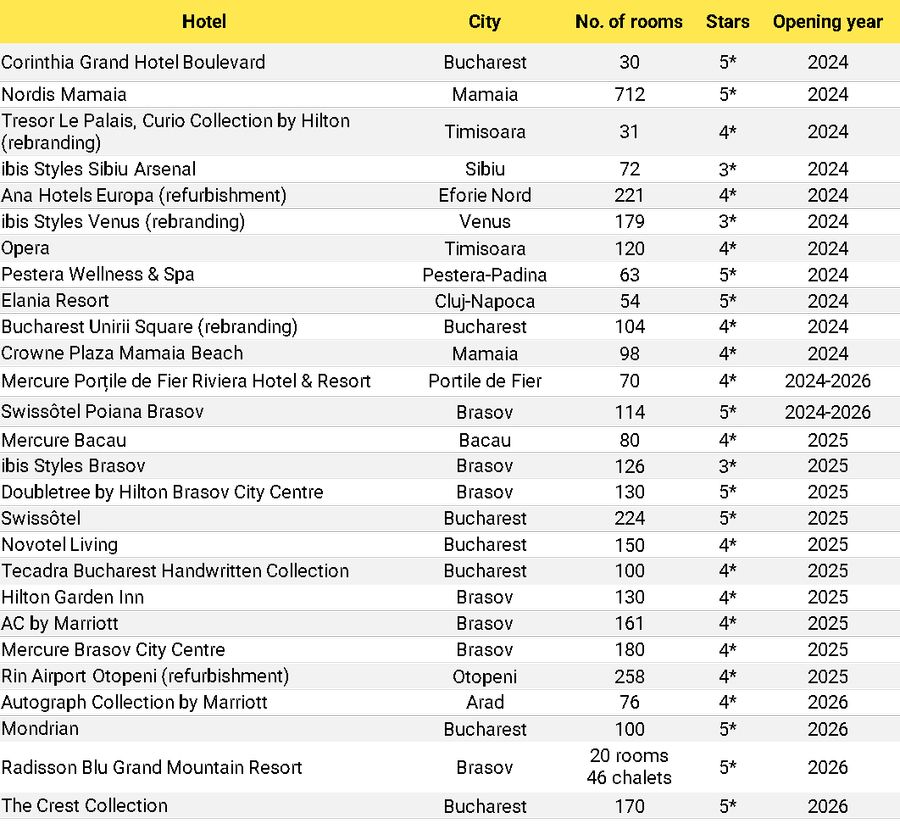 In 2024, se asteapta ca 13 proiecte hoteliere importante sa fie livrate pe piata romaneasca, inclusiv cinci hoteluri de cinci stele si sase hoteluri de patru stele. Mai mult, Romania atrage atentia operatorilor de hoteluri de lux, Kempinski, Mondrian, The Crest Collection si Hyatt sunt asteptate sa intre pe piata in urmatorii cinci ani. Acest aflux de branduri hoteliere high-end este de asteptat sa ridice standardele industriei ospitalitatii din Romania si sa atraga mai multi turisti internationali.
