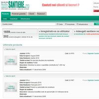 La data de 22 ianuarie 2009, in urma cautarii dupa cuvinte-cheie, s-au identificat urmatoarele rezultate: dupa tipul lucrarii (constructii civile = 1.522 de proiecte si santiere, constructii industriale = 452 de proiecte si santiere); dupa destinatia lucrarii (ansambluri rezidentiale = 406 proiecte si santiere, locuinte = 649 de proiecte si santiere, hale = 239 proiecte si santiere, hoteluri = 59 de proiecte si santiere, centre si spatii comerciale = 188 de proiecte si santiere, imobile de birouri = 318 de proiecte si santiere); dupa stadiul de executie (fundatie = 98 de santiere, sapaturi = 81 de santiere, structura = 481 de santiere, proiect = 246 de lucrari); dupa regim de inaltime (imobile P+ ... E = 1.504 santiere, imobile P+1E = 522 de proiecte si santiere, imobile P+2E = 329 de proiecte si santiere, imobile P+3E = 264 de proiecte si santiere, imobile P+4E = 235 de proiecte si santiere, imobile P+5E = 129 de proiecte si santiere, imobile P+6E = 98 de proiecte si santiere, imobile P+7E = 63 de proiecte si santiere, imobile P+8E = 73 de proiecte si santiere, imobile P+9E = 39 de proiecte si santiere, imobile P+10E = 48 de proiecte si santiere, imobile P+11E = 30 de proiecte si santiere, imobile P+12E = 30 de proiecte si santiere, respectiv imobile P+13-36E = 70 de proiecte si santiere). In ceea ce priveste criteriile cu privire la cereri si selectii de oferta, in baza de date exista 401 proiecte pentru care se cauta antreprenor, in timp ce la alte 298 de lucrari este necesara aprovizionarea cu materiale de constructii. Astfel, raspunsurile la intrebari precum cine, ce si unde construieste pot fi identificate, in premiera, prin intermediul site-ului www.infosantiere.ro. Stadiile de executie posibile, in care se afla cele 1.981 de lucrari importante, publicate in baza de date www.infosantiere.ro, sunt urmatoarele: proiectare finalizata (se lucreaza la detalii) sau proiect aflat in autorizare (aviz de mediu, PUZ, PUD etc.); autorizatie de construire eliberata si/sau cautare in vederea stabilirii antreprenorului general si/sau a subantreprenorilor; antreprenor desemnat si lucrare aflata in etapa organizarii de santier sau de pregatire a infrastructurii; executie fundatie (sapaturi si excavatii, foraje, izolatii etc.); executie structura de rezistenta (cu mentionarea fazei); executie inchideri exterioare, compartimentari interioare, finisaje, dotari etc. De asemenea, pot fi regasite si selectii de oferte pentru alegerea antreprenorului general si a subantreprenorilor de specialitate, precum si pentru atribuirea contractelor de livrare de materiale de constructii si finisaje, dotari si servicii specializate etc. Mai multe informatii cu privire la baza de date www.infosantiere.ro obtineti la tel/fax: 021-336.04.16; 021-336.04.17; 031-401.63.88 (persoane de contact: Hermina Mares, Marius Manea, Dana Diaconu).