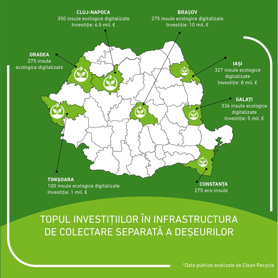 Marile orase din Romania investesc, in total, peste 30 milioane euro in insule smart de colectare separata a deseurilor. Brasov, Iasi si Cluj-Napoca sunt in topul oraselor cu cele mai mari investitii in infrastructura de colectare separata a deseurilor, potrivit datelor publice analizate de specialistii Clean Recycle. Unele dintre investitii au fost incepute in 2023, altele vor fi implementate pana in 2026, iar majoritatea finantarilor provin prin PNRR. In varful clasamentului este Brasov, cu o valoare totala de aproximativ 10 milioane euro. Municipiul Brasov a demarat un proiect pentru achizitia a 275 de insule ecologice digitalizate.