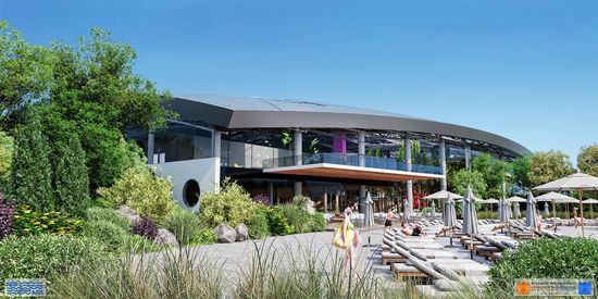 Zona de agrement exterioara, care cuprinde 2000 de utilizatori simultan, va fi dotata cu: 3 bazine exterioare (piscina de relaxare, piscina cu valuri), bazin pentru ansamblu tobogane, spatii comerciale, terenuri de sport, terase exterioare si spatii verzi. De asemenea, vor fi realizate 556 de locuri de parcare pentru autoturisme, din care 26 de locuri vor fi pentru persoanele cu handicap, si alte 10 locuri de parcare vor fi destinate autobuzelor.