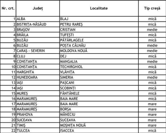 Ministerul Dezvoltarii a aprobat finantarea a inca 22 de crese moderne si eficiente din punct de vedere energetic, a anuntat ministrul dezvoltarii, lucrarilor publice si administratiei, Cseke Attila.Astfel, in Baia Mare, Suceava, Mosnita Noua, Borsa si Maneciu, va fi construita cate o cresa mare (pentru cate 100-110 copii). Localitatile Cristian, Mangalia, Simeria, Posta Calnau si Moldova Noua vor beneficia de cate o cresa medie (fiecare cu o capacitate de 70 de copii). Totodata, cate o cresa mica (pentru cate 40 de anteprescolari) va fi finantata in Blaj, Techirghiol, Dej, Vlahita, Pascani, Scobinti, Baia Mare, Fantanele, Isaccea, Petru Rares, Tufesti si Patarlagele.