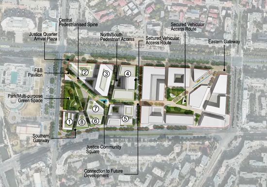 Viitorul Cartier pentru Justitie va fi construit pe un teren cu suprafata de 53.515 mp, reprezentand jumatatea vestica a fostei Esplanade, delimitat de Bd. Unirii, Bd. Octavian Goga, Str. Nerva Traian si Bd. Mircea Voda. Proiectul prevede constructia a 8 cladiri, cu o suprafata desfasurata totala de 222.394 mp, in care se preconizeaza ca vor lucra aproximativ 7.000 de angajati ai diverselor institutii judiciare ce vor functiona in Cartierul pentru Justitie, astfel: